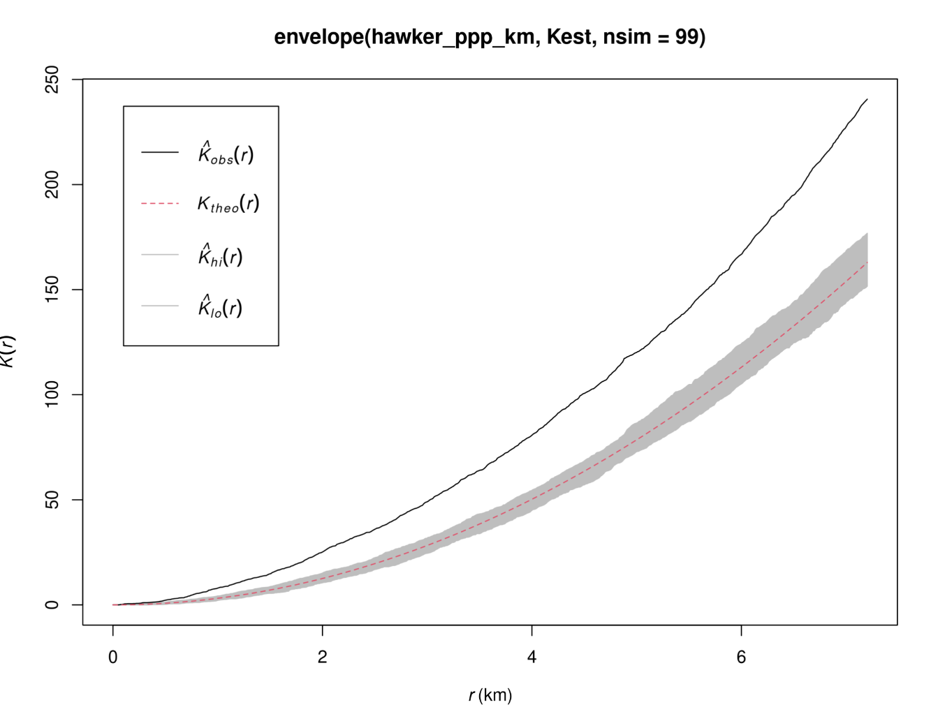 K-function: above CSR envelope → significant clustering