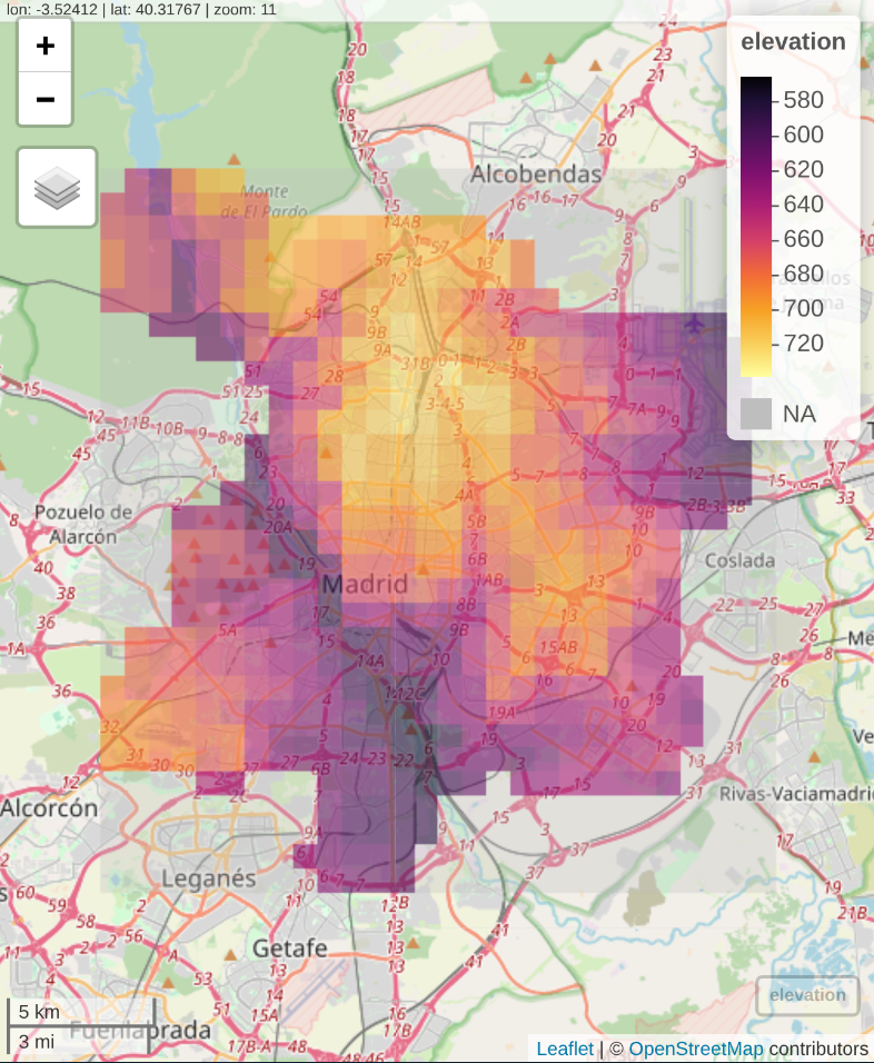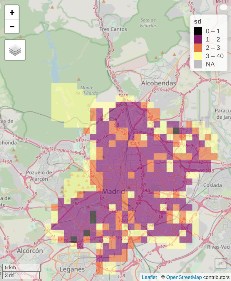 In summary, this study mapped noise pollution across Madrid using yearly average LAeq measurements and geospatial covariates, including elevation, NDVI, and distances to roads. A Bayesian INLA-SPDE model captured spatial correlation, predicting highest noise levels in central districts and near major traffic corridors, while peripheral and greener areas remained quieter. Elevation showed a positive association, likely reflecting the urban core’s location rather than a direct effect, and other covariates were mostly non-significant. Despite moderate predictive accuracy (RMSE = 3.18 dB) and limitations such as biased station placement and stationary spatial assumptions, the results provide actionable insights for identifying high-risk noise areas and informing urban planning strategies.