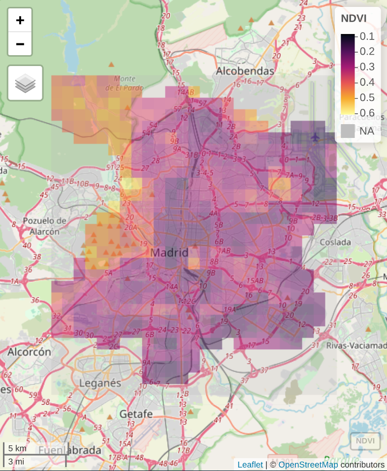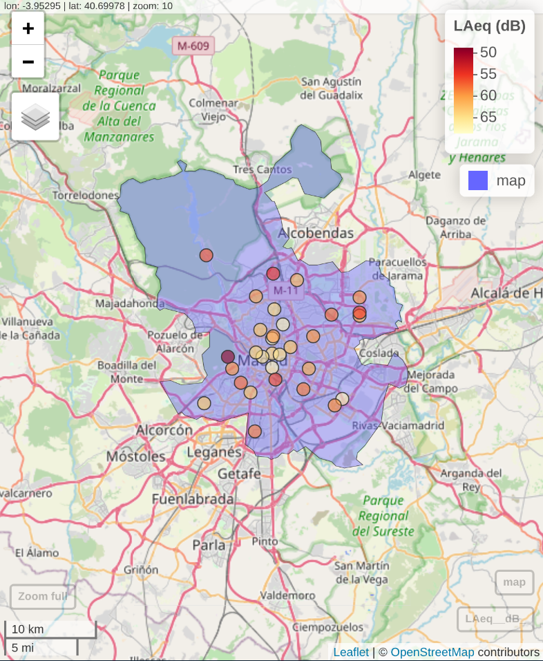 Environmental noise measurements were sourced from the Madrid City Council’s monitoring network, containing 31 stations coordinates and annual mean sound levels (LAeq) (@. Data were cleaned, aggregated to the year 2024, and spatially transformed to the ETRS89 / UTM Zone 30N (EPSG:25830) coordinate reference system.