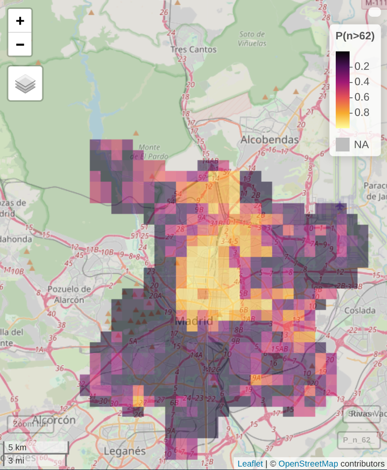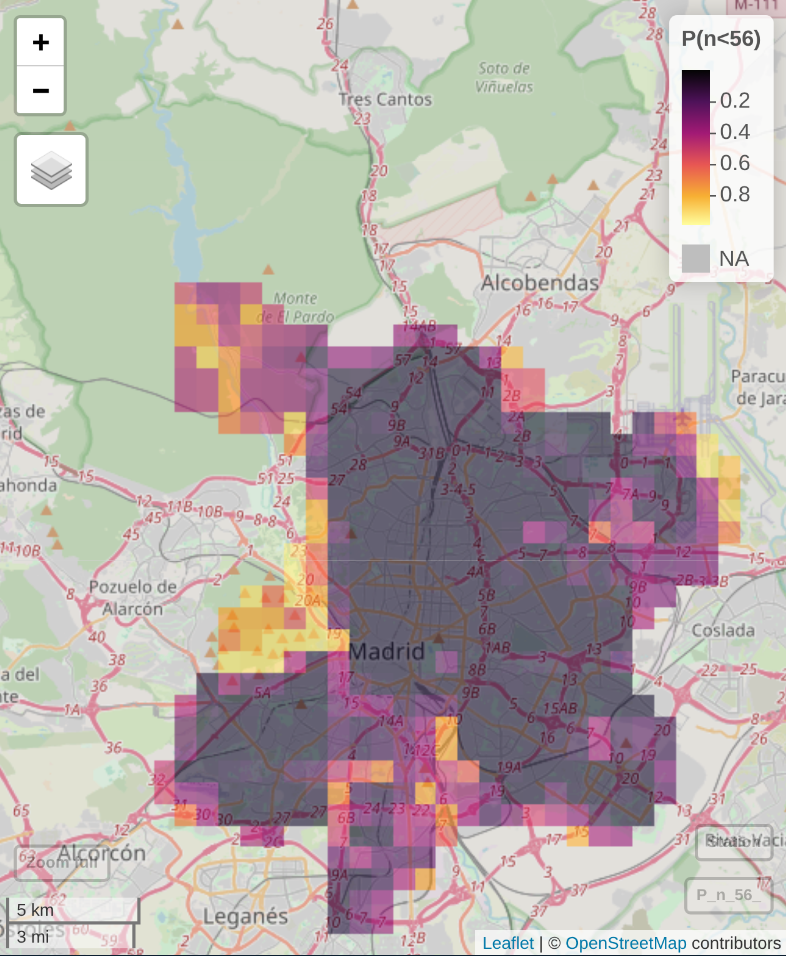 Exceedence probability analysis revealed that it is very likely for noise level to surpass healthy threshold of 62 dB near major traffic corridors, particularly within the city center. Additionally, the low exposure zones (below 56 dB) are rare and located near parks and mountains Northwest of Madrid.